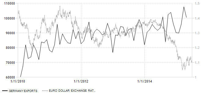 ניתן לראות שב- 2010 היצוא הגרמני עלה מרמות של 60 מיליארד אירו בחודש כאשר אירו דולר היה ב-1.4 לרמות של 100 מיליארד אירו בחודש היום כאשר האירו דולר נחלש לרמה של 1.1.