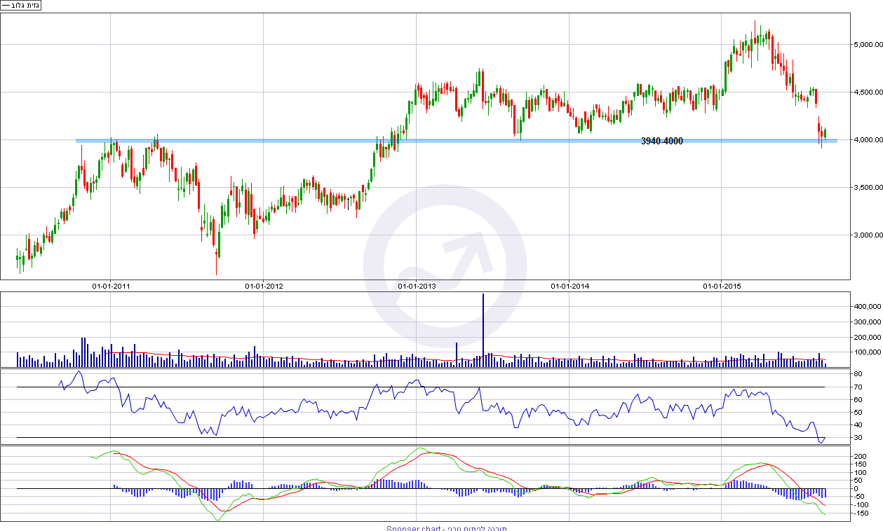 בשבוע שעבר קבעה המניה נמוך תקופתי חדש ברמה של 3910 נקודות אולם נעלה את שבוע המסחר מעל רמת 4000 הפסיכולוגית והטכנית. ניתן לראות בגרף השבועי שהמניה נסחרת באזורי תמיכה חזקים מאוד מהעבר, רצועת התמיכה של 3940/4000 נקודות הינה אזור חזק מאוד מאוד טכנית, כזה שנותן אפשרות כניסה למניה לחובבי התחתיות ולמשקיעים היותר אגרסיביים. אציין, שנעילה מתחת לרצועת התמיכה תהיה שלילית מאוד ותעמיק את התיקון הקיים. אולם בשלב זה, כל עוד מחזיקים מעל הקרדיט יינתן לקונים.