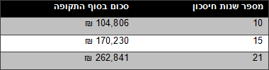 אם ניקח לדוגמא אדם שרוצה לחסוך עבור בנו 750 ₪ בחודש, להלן חישוב הסכום בסוף התקופה על פני מספר שנות חיסכון (החישוב מבוסס על תשואה שנתית נטו של 3%).