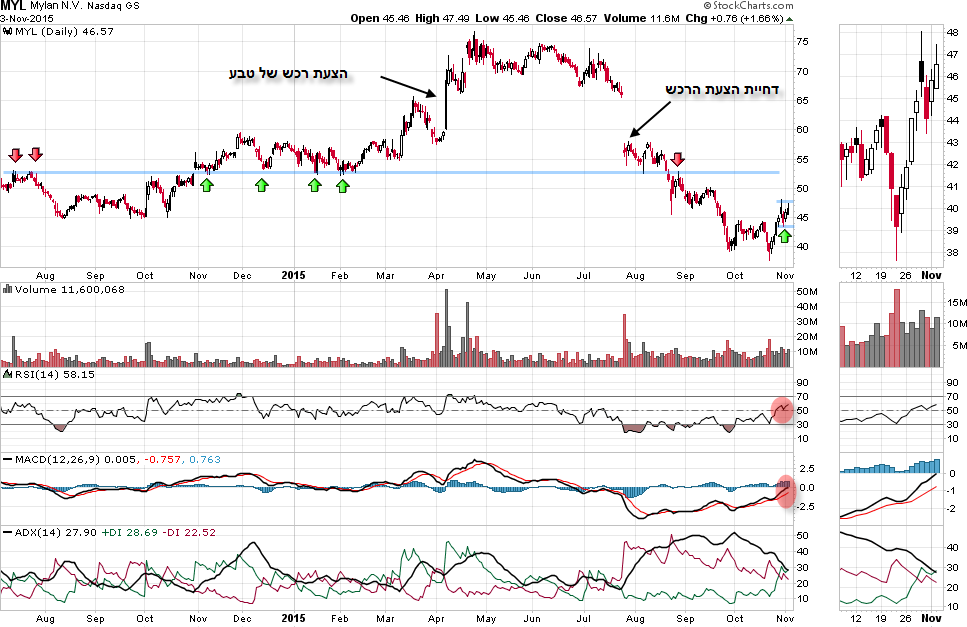 ניתוח טכני מראה את העליות בחודש אפריל האחרון על רקע הרצון של טבע לרכוש את המניה. עליות מרמת מחירים של 60 דולר לרמות שיא של 75 דולר. לאחר שהצעת הרכש במניה הופלה ע"י בעלי המניות של חברת מיילן, התממשה המניה בחדות יחד עם המימוש בשוק וירדה עד לרמות שפל סביב 40 דולר.