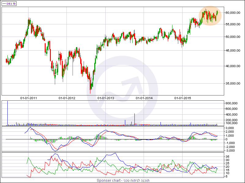 מהזווית הטכנית, הדשדוש הנוכחי חיוני להמשך המגמה העולה. המניה נסחרת במגמה חיובית מאוגוסט 2012 כאשר את 2013-2014 חתמה בדשדוש משמים ורק בתחילת השנה הנוכחית המניה יצאה למהלך עולה ופריצת השיא משנת 2011 סביב אזור 56,980 נקודות.