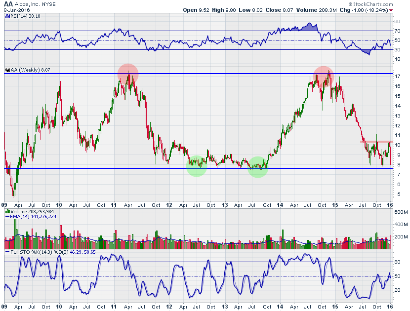 מניית אלקואה נחתכה ביותר מ- 50% מהשיא שנרשם בחודש נובמבר 2014 סביב רמה של 17.30 דולר, אותו אזור שבלם את גל העליות מהשנים 2010-2011. מדובר בתצורה די דומה וגם הפעם המניה יכולה לסמן תחתית באזור 7.50-7.60 דולר ולהתהפך חזרה כלפי מעלה.