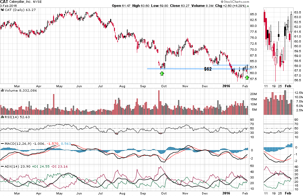 קטרפילר (סימול: CAT) עוסקת בייצור ושיווק של מכונות למגוון תעשיות (בעיקר לבנייה וחקלאות). החברה בנויה מ 4 חטיבות: חטיבת המכונות, חטיבת המנועים, חטיבה פיננסית וחטיבת הביטוח. בנוסף, החברה מחזיקה חברת לוגיסטיקה המספקת פתרונות ושירותים מסביב לעולם. החברה נסחרת במדד הדאו ג’ונס 30 והאס אנד פי 100 ו 500 לפי שווי שוק של 36.84 מיליארד דולר.