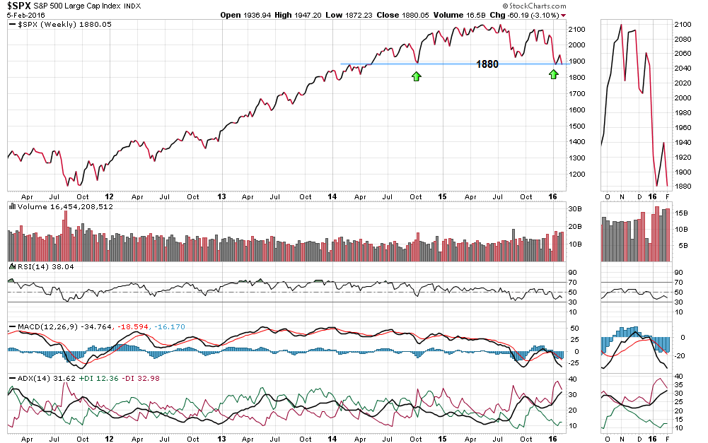 בגרף השבועי ניתן לראות שבינואר האחרון המדד קבע נמוך תוך יומי סביב 1812 נקודות, רמה שלא נראתה על הגרף מאז השבוע של ה 10 לפברואר 2014 (קרוב לשנתיים). מבחינת שערי סגירה שבועיים לא ראינו סגירה מתחת ל 1880 נקודות בכל הגלים האחרונים לרבות בשנת 2014 כך שגם לרמה זו ניתן לתת משקל חשוב מאוד בגרף השבועי.