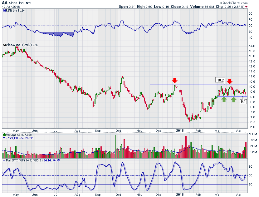 מניית אלקואה, אשר פתחה את שנת 2016 בירידות שערים חדות השילה 32% מערכה תוך שלושה שבועות והחל מסוף חודש ינואר החלה במגמת תיקון עולה משפל רב שנתי ברמה של 6.71 דולר ועד לרמה של 10.03 דולר. תיקון חד ומרשים, בהתאם להתאוששות סקטור האנרגיה והמתכות.