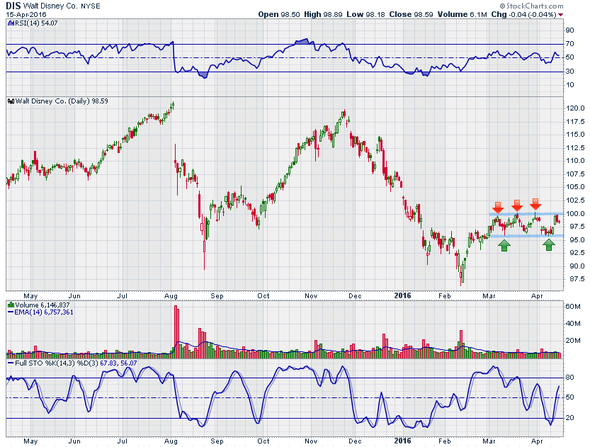 מניית וולט דיסני נסחרת בירידות שערים מתחילת השנה. עד כה המניה ירדה בכ- 6% כאשר בשפל השנתי שנרשם במהלך חודש פברואר המניה נסחרה בירידה של כ- 15.5%. מאז המניה הספיקה להתאושש ובחודשיים שחלפו נסחרת בתנועה צידית (דשדוש) בטווח מחירים 96-100 דולר.