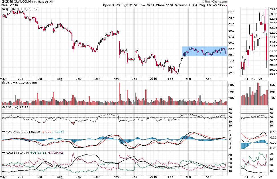 בחודשיים האחרונים המניה משייטת בין אזור התנגדות של 53.2-53.5 לאזור תמיכה סביב 50 דולר (נמוך סומן ברמה של 49.67 דולר). התנועה הצידית לאחר מהלך העולה הינו דבר בריא מאוד שכן כסף "ישן" מחליף ידיים עם כסף "חדש".