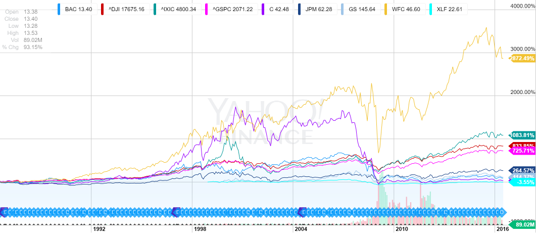 בגרף הבא נוכל לראות ביצועים של "בנקי על" כגון סיטיבנק, בנק אוף אמריקה, ג’יי פי מורגן צ’ייס, וולס פארגו, גולדמן סאקס ואם אנחנו רוצים לא להיות ספציפיים, בחנו אפילו את ה-ETF המוכר XLF שעוקב אחר סקטור הפיננסים (שעליו יש נתונים רק משנת 1999). התוצאה היתה מחפירה, בלשון המעטה. למעט וולס פארגו, כל הרשימה כולל מדד הסקטור הפגינו חולשה משמעותית מול מדדי בנצ’מארק המקובלים (דאו גונס, אנס אנד פי 500, נאסד"ק).