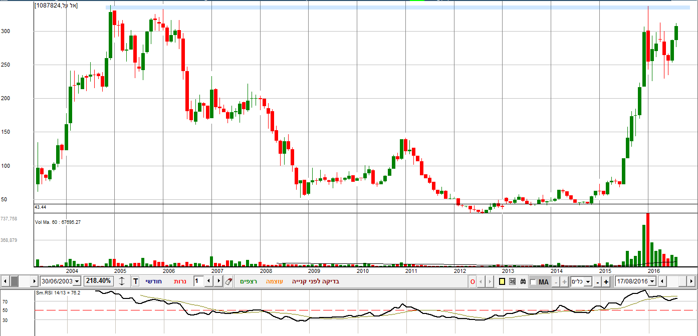 מהבחינה הטכנית בגרף חודשי ארוך של 12 שנה ניתן לראות את השיא שנקבע בתחילת השנה סביב 337 נקודות, שיא שבלם את המניה בשנת 2004 ו 2006, כך שמבחינה זו המניה יצא לתיקון מאזור שיא כל הזמנים וחזרה אליו בתחילת השנה לאחר לא מעט שנים של שפל.