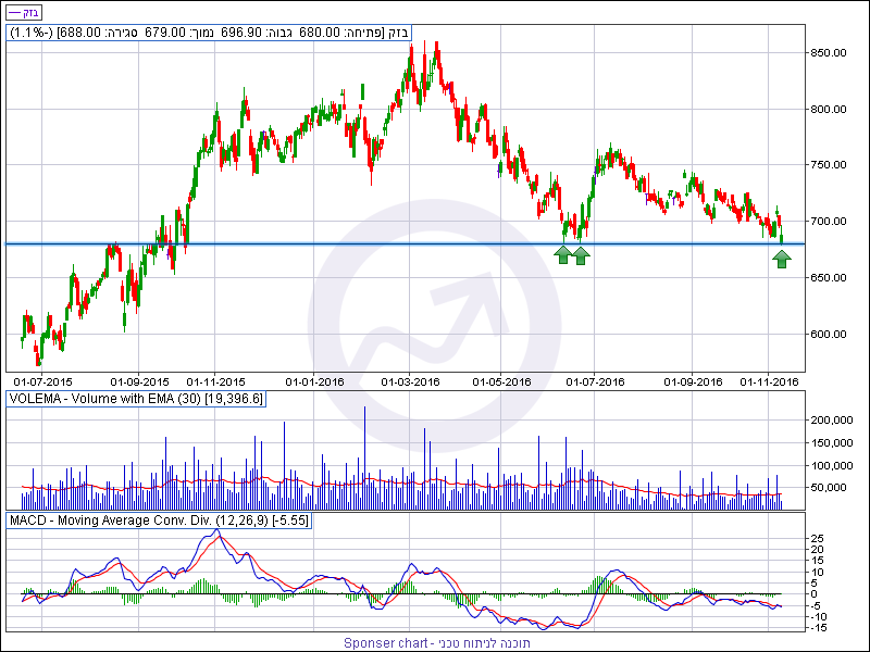המניה פתחה את יום המסחר על רמה של 680 נקודות. רמה זו משמשת כרמת תמיכה מהותית אשר בלמה את גל הירידות ברבעון השני של שנת 2016 וגם היום, נכון לשעת פרסום הסקירה.