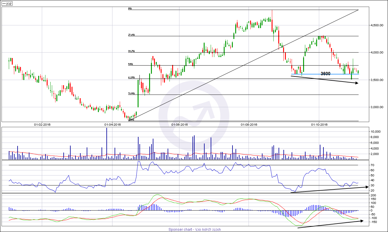 ניתוח טכני - החודש וחצי האחרונים לא היטיבו עם המניה והיא חזרה שוב לאזור תמיכה חזק מאוד סביב 3600 נקודות. בנוסף, הנמוך האחרון ברמה של 9.11 הינו תיקון פיבו 61.8% למהלך העולה האחרון שחל מאפריל השנה והסתיים בשיא שנתי בחודש אוגוסט.