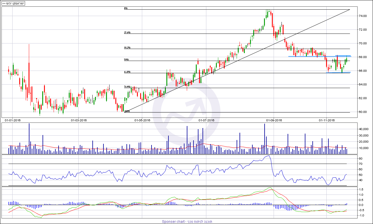התמיכה אשר נוצרה על הגרף בעקבות הגעת קונים ברמה של 66 נקודות הינה רמה טכנית כפולה, גם אזור תמיכה כאמור וגם תיקון פיבו 61.8% למהלך העולה האחרון במניה מאזור של 60 אגורות לרמות שיא שנתיות סביב 75.