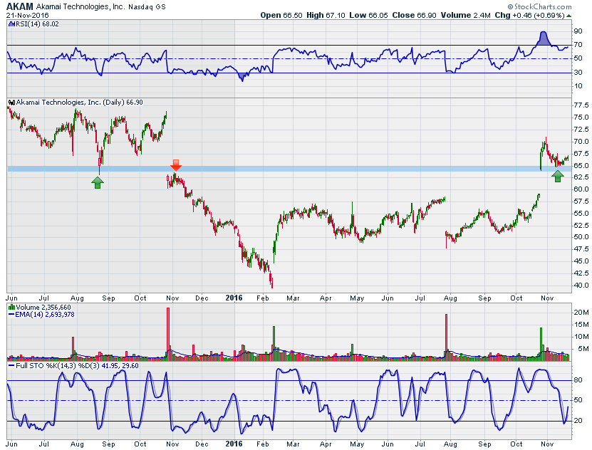 הדו"ח הרבעוני הזניק את המחיר ובכך המניה שברה את תקופת הדשדוש ואף פרצה רמת התנגדות היסטורית משנת 2015 סביב 65 דולר. אזור זה שימש בעבר כרמת תמיכה ומאז אוקטובר 2015 המניה נסחרה במגמה שלילית לאחר שירדה כמעט 50%. את שנת 2016 המניה פתחה במגמה שלילית והחל מהרבעון השני המניה מדשדשת.