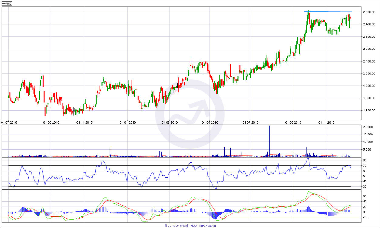 מהבחינה הטכנית המניה נראת מצוין, המניה נסחרת בחודשיים האחרונים באזור התנגדות אופקי חזק מאוד ברמה של 2500/30 נקודות שהוא שיא כל הזמנים משנת 2014. הדוחות אשר פורסמו אומנם לא הצליחו לדחוף את המניה לגבוה חדש אך יחד עם זאת המניה שומרת מאז על קשר עין ונדבקת אל השיא.