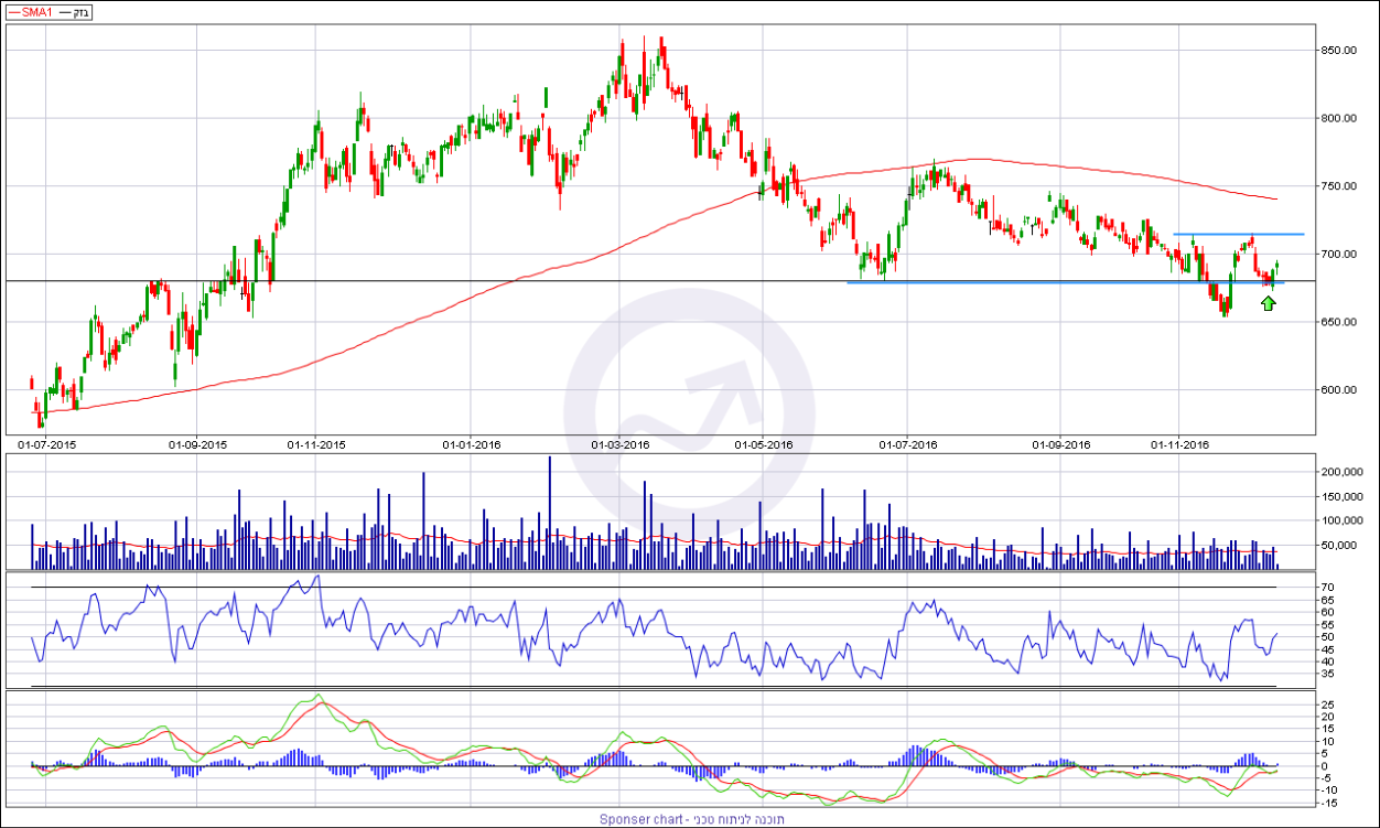 המימוש האחרון במניה הביא אותה לשפל של שנה ושבירה זמנית של 678/680 נקודות. בשבועות האחרונים נראה שיש סוג של מפנה היציאה האחרונה קדימה והבלימה סביב 714 נקודות החזיר את המהלך היורד האחרון. בנוסף המימוש של השבוע שעבר וההיפוך בסופו הביא לשפל עולה ראשון מעל אזור תמיכה חשוב סביב 680 נקודות.