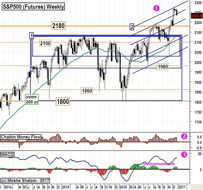 תחום יחסית צר של 120 נקודות מדד, בין 1500 ו-1380, היה זירת התנועה שבה המדד התנהל כל שנת 2016. לא רק זאת אלא שהשפלים החוזרים ונשנים, מאז תחילת 2016, היו שפלים נמוכים זה מזה כפי שהחיצים הסגולים מראים היטב. גם התקרה לא הייתה ישרה אלא יצרה קו מגמה עליון חוסם: קו המגמה 1 כחול ששיאיו גם הם יורדים. כל זה יצר תחושה של חולשה כללית לעומת הרבה מאוד שווקים בינלאומיים, ובמיוחד בהשוואה לנעשה בארה"ב. נא ראו את 1 סגול בגרף.