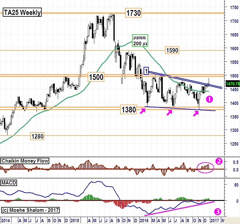 המדד עומד סביב הפריצה של קו המגמה אשר תחם את התנועה מאז תחילת 2016, ונתמך על ידי אינדיקאציה חיובית למדי. למעשה, הייתה פריצה של הרגע האחרון, וחזרה (בודקת?) לכיוון קו המגמה. זהו מצב של פוטנציאל טוב במיוחד להצלחה מאושרת של פריצה מעלה, ולהגעה חוזרת להתנגדות הגדולה סביב 1500. שם ייקבע העתיד של שוק המניות שלנו.