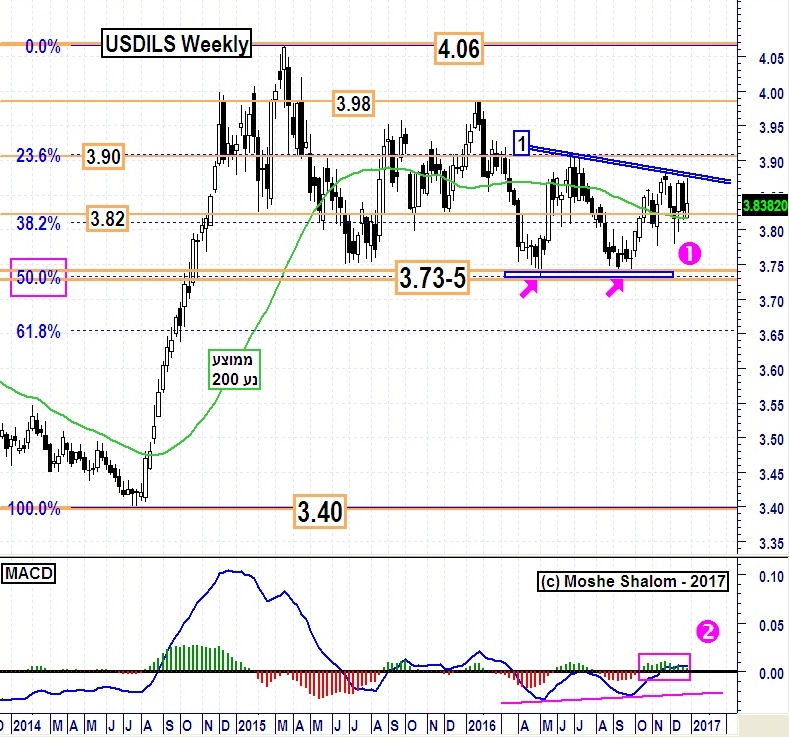 למעשה, בגרף השבועי שלפנינו, אנו רואים שהמגמה הכיוונית האחרונה בדולר הייתה כולה בשנת 2014. מאז, המטבע האמריקאי נע ונד בחוסר כיווניות הורסת מוראל. אין ספק שאזור הרצפה של התחום הוגדר היטב: אזור 3.73-5. שם המוכרים פגשו לא רק מאמינים, וספקולנטים, אלא גם את הבנק המרכזי. בנוסף, יש לציין שזהו גם אזור ה-50 תיקון פיבונצ"י הקלאסי. נא ראו את 1 סגול בגרף המצורף.