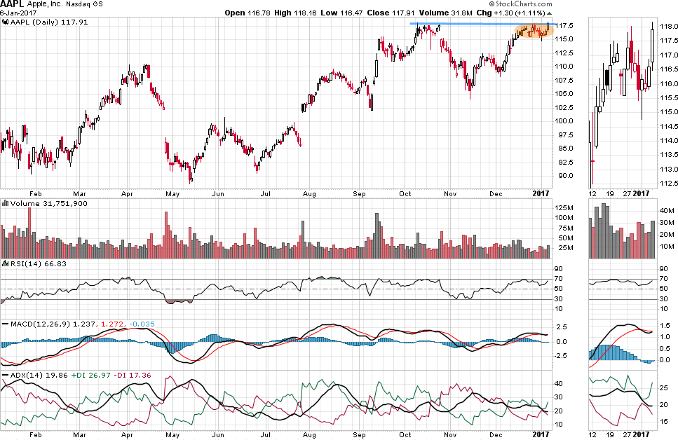מניית אפל חזקה מאוד מהבחינה הטכנית. המניה נסחרת צמוד מאוד לגבוה 52 שבועות ברמה של 118 דולר למניה. בגרף המצורף ניתן לראות שהמניה נצמדת לאזור זה כבר 3 שבועות ועל פניו מכינה מהלך עולה מעלה.