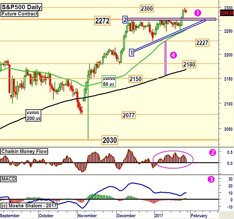 כמו כן, ציירתי כמה קווי מגמה מקבילים לקו המגמה התומך 2 כחול, והנה המחיר נמצא ממש מתנגד לראשון מביניהם. כל זה כאשר אנו רואים התאוששות באינדיקאציה. התאוששות מסויגת. הן בזרימת ההון, ב-2 סגול, המראה עדיין יציאת כסף מן המדד, והן במומנטום, ב-3 סגול, הנמצא עדיין בתאוצה שלילית.