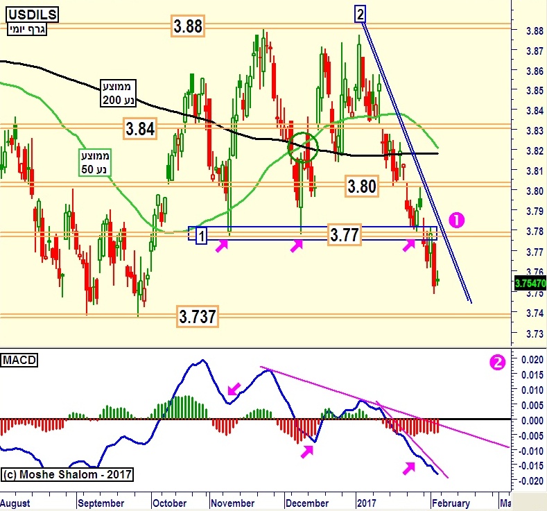 בסקירה הקודמת ציינתי ששבירה מטה של 3.77 תייצר מבול של פקודות קטיעת הפסד, ותזרז מגמה יורדת, וכך היה, כאשר היעד הברור כרגע הוא הנקודה בה התערב בנק ישראל בצורה בוטה למדי סביב 3.737. מחפשים סימנים של עצירה? אין כאלה כרגע. אבל לעתיד ניתן לציין את קו המגמה 2 כחול, ובמיוחד קו המגמה הסגול במומנטום, כמחסומים שפריצה מעליהם יאמרו משהו שונה.