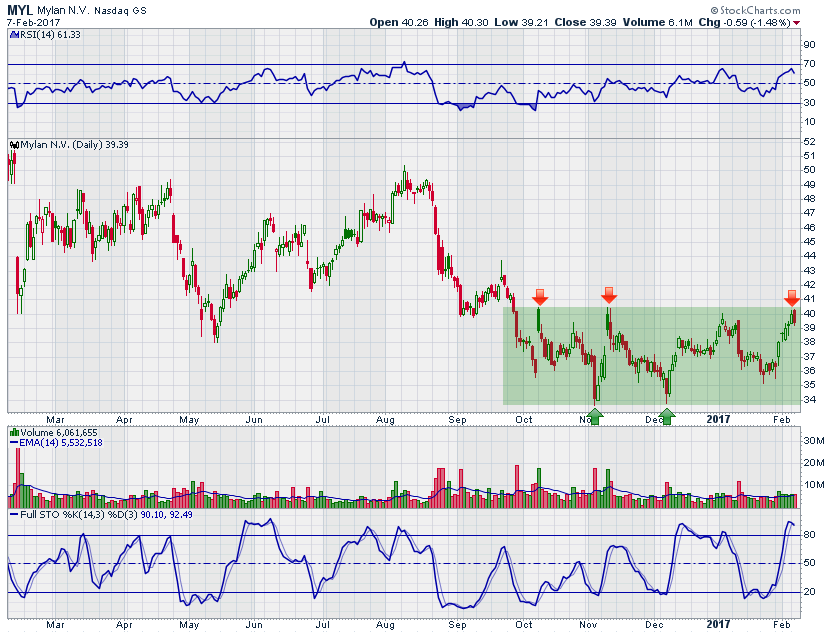 אחרי ירידה של כ- 50% מהשיא שנרשם באפריל 2015 סביב רמה של 76 דולר, המניה מתבססת כארבעה חודשים מעל אזור השפל בטווח מחירים שנע בין 33.80 דולר (השפל האחרון) לבין 40.60 דולר שהפך לאזור התנגדות במהלך תקופת הדשדוש הנוכחית.