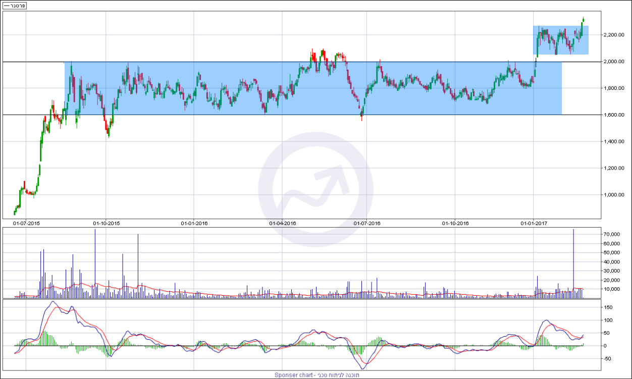 בתחילת השנה פרצה המניה את אזור ההתנגדות בצורה ברורה ועוצמתית ופתחה יעדים עולים לטווח הבינוני ארוך. בטווח היותר קצר הפריצה אכן הביא למהלך עולה נאה אולם בחודש האחרון קיימת עצירה במחיר בין 2050 ל 2250 נקודות שנפרצה אתמול לקראת סיום המסחר.