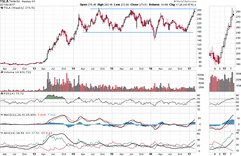 בגרף השבועי של 5 השנים האחרונות ניתן לראות את רמות השיא בהן החברה נסחרת. הריצה האחרונה במניה מאזור של 180 דולרים הביא את המניה לרמה של 287/290 דולר למניה, אזור שפעמים בשנים האחרונות בלם את המניה ושלח אותה חזרה לאזור של 1800-200 דולר, פעם ראשונה בשנת 2014 ופעם שנייה מהשיא של 2015 לשפל של 140 דולר.