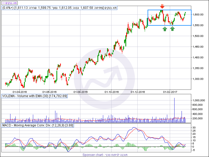 מהזווית הטכנית, המדד מדשדש מתחילת השנה סביב רמות השיא בטווח מחירים שבין 1550 נקודות מלמטה ו- 1622 נקודות מלמעלה. לאומי, מזרחי, דיסקונט ובינלאומי נסחרות בשיא השנתי בעוד שמניית פועלים רחוקה בכ- 3% מהשיא כך שהצטרפותה למגמה החיובית תביא לפריצת ההתנגדות והשיא השנתי במדד הבנקים ב- 1622 נקודות