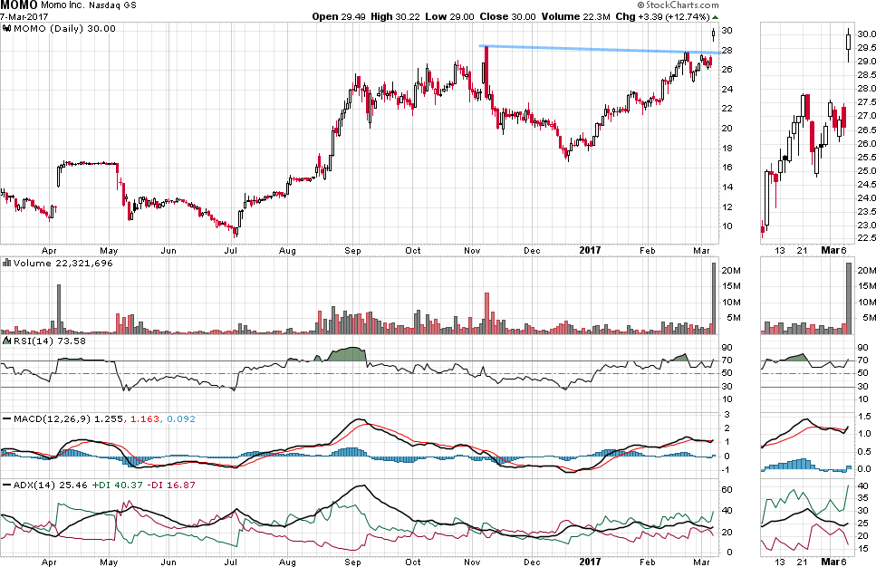 חברת מומו (סימול- MOMO) מפעילה פלטפורמת רשת חברתית בסין אשר מותאמת לטלפונים ניידים. החברה מציעה למשתמשים לקיים קשר חברתי מבוסס מיקום ותחומי עניין. לחברה יש מעל ל 80 מיליון יוזרים פעילים. מניות החברה נסחרות בבורסת הנסד"ק לפי שווי שוק של 5.4 מיליארד דולר.