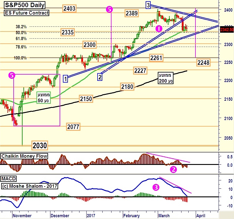 לדעתי, רק שבירת קו המגמה 1 כחול, יהיה מאורע מכונן בעניין זה. בינתיים: סביבת המחיר של 2335 היא הרצפה המינורית, וסביבת 2389 או 2400 הם הגבולות העליונים. אגב, כל מה שהזכרתי בנושא הקופסאות המסומנות 5 סגול, והמרחק הגדל בין הממוצעים הנעים, ממשיך להיות בתוקף כמובן, ולהעיב על הצד החיובי של הדברים.