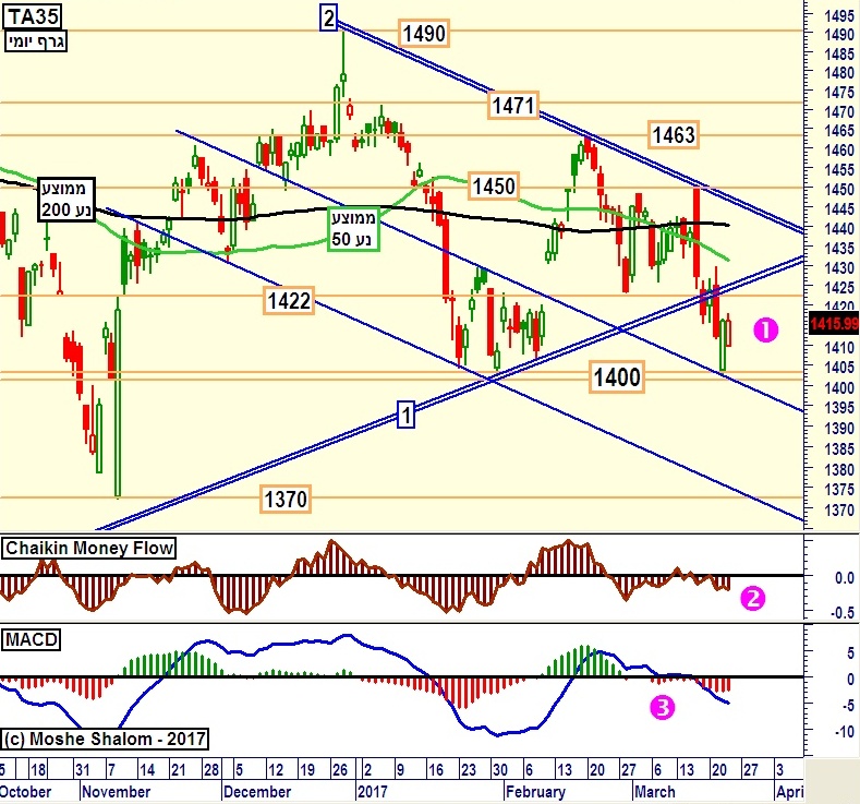 לפני מדד המניות העיקרי שלנו כמה תסריטים אפשריים, כאשר לחיוביים אני רואה כרגע רק אחד: הפיכת רמת המחיר סביב 1400 כבסיס למשולש ישר זווית כאשר, בשלב ראשון, המדד ינוע לכיוון קו המגמה 2, ויבדוק אותו מלמטה.