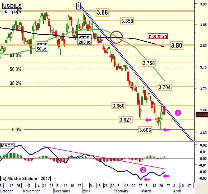 בינתיים, אין חדש כל כך בזירת המט"ח המקומית. שלושת הימים האחרונים של השבוע שעבר לא הצליחו לשנות את הדבר הקובע באמת והוא אי הצלחת הפריצה מעל קו המגמה 1 כחול. סביבת 3.660 נשארה המחסום הזמני למחיר, והדולר המקומי לא הצליח לייצר תנועת נגד יותר ממינורית אחרי המכה הגדולה שהוא קיבל מאז השיא סביב 3.88. נא ראו את 1 סגול בגרף היומי המצורף.