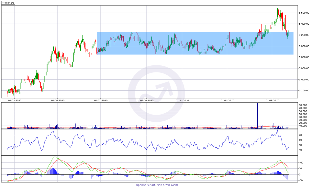 הבלימה שנרשמה ביום חמישי האחרון יחד עם העליה היום, הגיעה באזור שהתנגד מספר פעמים רב בחודשים האחרונים סביב רצועת מחיר של 6200/6250 נקודות לערך.
