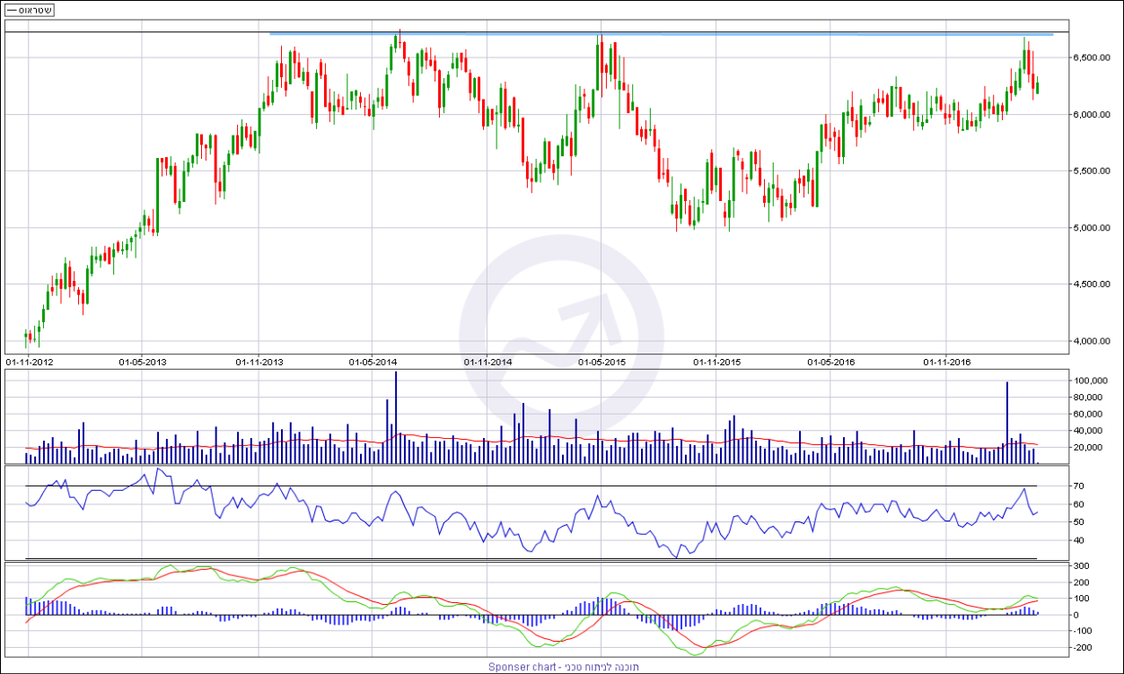 בגרף השבועי המצורף לסקירה, ניתן לראות את רמת השיא של השנים האחרונות סביב אזור של 6700 נקודות אשר התנגדה השנה פעם אחת וקרוב ל 3 פעמים בשנים 2013-2015.