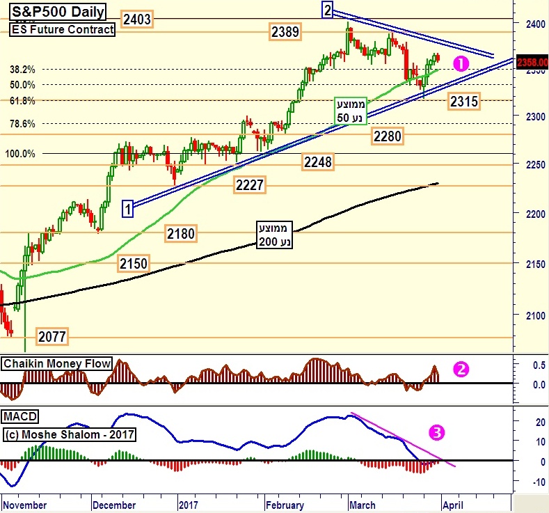 הדבר המכריע ביותר לגבי תנועת המחיר של המדד עוד לפנינו, והוא המפגש העתידי שבין המדד, וקו המגמה העולה 1 כחול. מפגש כזה היה בשבוע שעבר, והוא הניב את אותה החזרה מעל הממוצע הנע 50 יום. כאשר המדד יגיע לשם פעם שניה, יש לי תחושה שנקבל תשובות ברורות יותר לגבי הטווח הבינוני-ארוך.