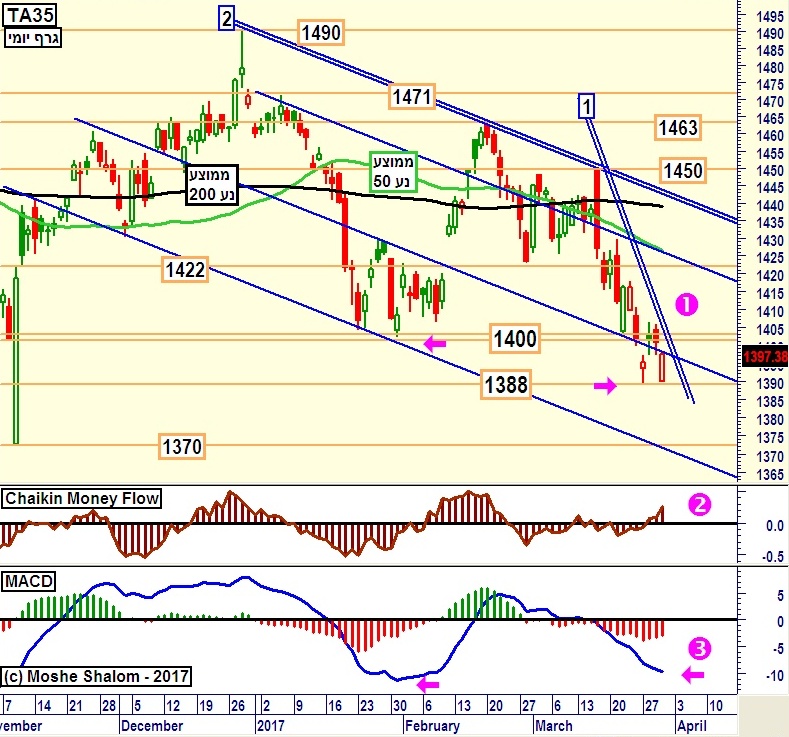 לפני שאסביר מדוע, הבה נסקור את שהיה בשבוע שעבר, ונאמר מיד ששבירת רמת התמיכה סביב 1400 הניבה את הנר היפה ביותר של התקופה הנסקרת, דהיינו זה של יום שני. בנר ההוא ראינו נמוך יומי אשר הגיע עד סביבת 1388, וכלל פער מחירים קטן. נא ראו את 1 סגול בגרף היומי המצורף.