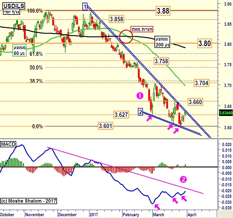במקרה שלפנינו קו המגמה הרלוונטי הוא קו המגמה 1 כחול אשר תחם את הירידה מאז תחילתה, דהיינו מאז 3.88. זהו המבחן המיידי, וזהו המבחן שאותו אנו דורשים מן הדולר המקומי להצליח לבצע. אגב, שבירה של רמת המחיר סביב 3.601 תהיה אישור קטסטרופאלי להמשך יורד מאסיבי.