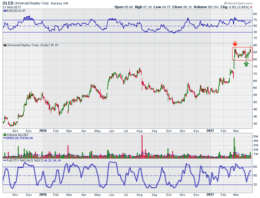 יוניברסל דיספליי (סימבול: OLED) – החברה עוסקת במחקר, פיתוח ומסחר של טכנולוגיות דיודות אורגניות לשימוש בצגים צבעוניים ניידים ונייחים. החברה מספקת רישיונות שימוש בטכנולוגיה שפיתחה ליצרני טלפונים ניידים, מחשבים, טלוויזיות ומוצרי חשמל. מניות החברה נסחרות בבורסת הנאסד"ק לפי שווי שוק של 4.05 מיליארד דולר.