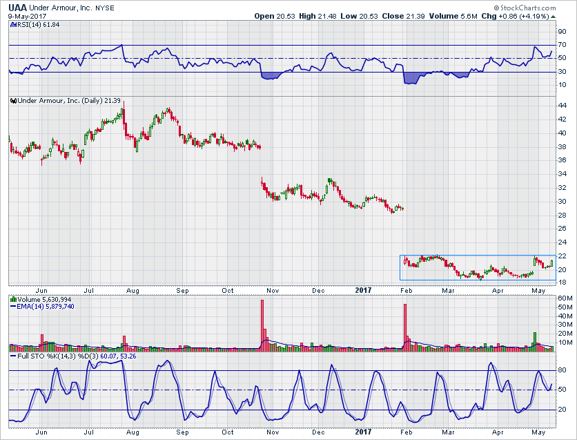 מניית אנדר ארמור מחקה רבע משוויה בסוף חודש ינואר לאחר שפרסמה על מכירות רבעוניות נמוכות מהצפוי. מאז הירידה החדה המניה מדשדשת בטווח מחירים צר יחסית כאשר אזור 22 דולר מהווה רף דשדוש עליון והתנגדות מובהקת. מלמטה אזור 17.5 דולר משמש כאזור תמיכה.