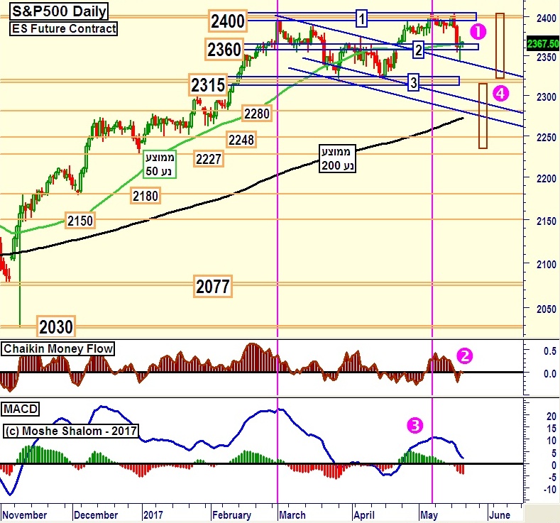 לכן, כאשר יש רקע של אינדיקאציה כה נחלשת די צפוי שהניסיון לעבור מכשול טכני כה חשוב, כמו הממוצע הנע 200, ייכשל ולו בפעם הראשונה. מה שהיה מפתיע הוא הירידה חזרה מתחת לקו המגמה 2 כחול, ובמיוחד מתחת לממוצע הנע 50 יום. נא ראו את 1 סגול בגרף היומי המצורף.