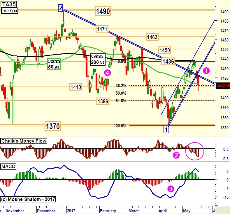 עבור החיוביים המצב פשוט למדי: חזרה מעל הממוצע הנע 50, ובמיוחד חזרה מעל קו המגמה 2 כחול, דהיינו מעל אזור 1425. פעולות אלו חיוניות. כמובן שההתמודדות מול הממוצע הנע 200 תהיה אז קריטית להמשך. במקרה כזה אומרים: עוד חזון למועד.