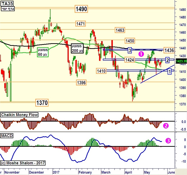 סביב רמה 2, דהיינו 1424, ורמה 1, דהיינו 1410, ישנם הרבה גורמים טכניים מעכבים או תומכים. נזכיר פערי מחירים, כאמור, רמות מחיר חשובות היסטורית, קו מגמה עולה תוחם עלייה, ולבסוף ממוצע נע 50 יום של הטווח הבינוני.
