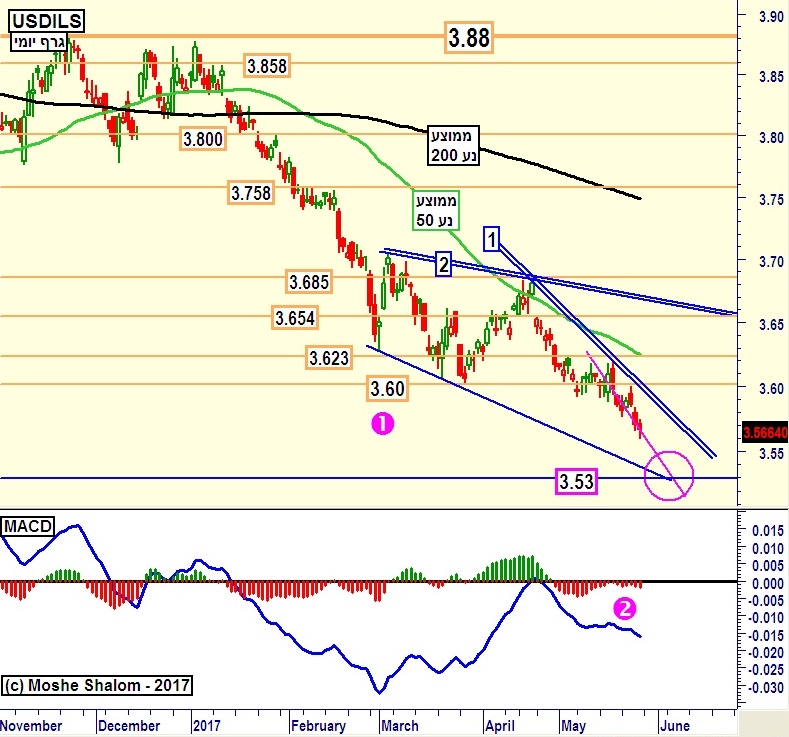 מן הירידה הגדולה האחרונה, דהיינו זו אשר החלה סביב 3.685, יש לנו כעת שלושה מערכים טכניים תוחמי ירידה: הראשון והברור מכולם הוא קו המגמה 1 כחול, אשר מושם על השיאים של אותה ירידה. השני קו המגמה 2 כחול, אשר מהווה את התמונה הגדולה יותר בצורה של מגפון נפתח כללי, והשלישי, הוא הממוצע הנע 50 הנמצא שם כנקניק בסנדוויצ" הזה.