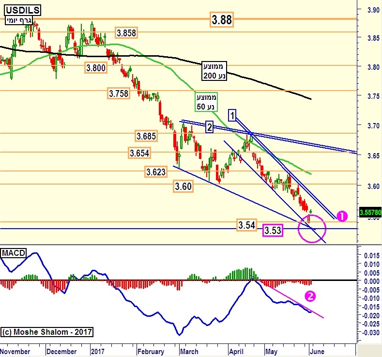 שבוע שעבר מתחתי את קווי המגמה על השפלים של פברואר ומרץ, ומתחתי את קצב הירידה של הדולר שלנו כך שהגענו להערכה ליעד אפשרי של עצירה זמנית-קבועה סביב 3.53. בפועל, זווית הירידה המשיכה להיות יציבה, והמטבע האמריקאי הגיע בפועל לסביבת 3.54. לא רע.