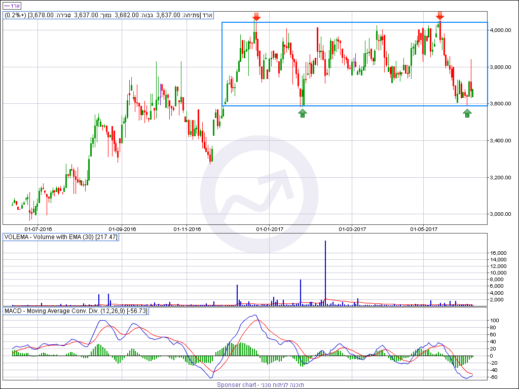 בימים האחרונים המניה מתבססת מעל אזור הרף התחתון של הדשדוש הנוכחי סביב 3,590 נקודות. מדובר בהתבססות כפולה לאחר שהתהפכה פעמיים בפרק זמן קצר, אולם טרם החלה לתקן.