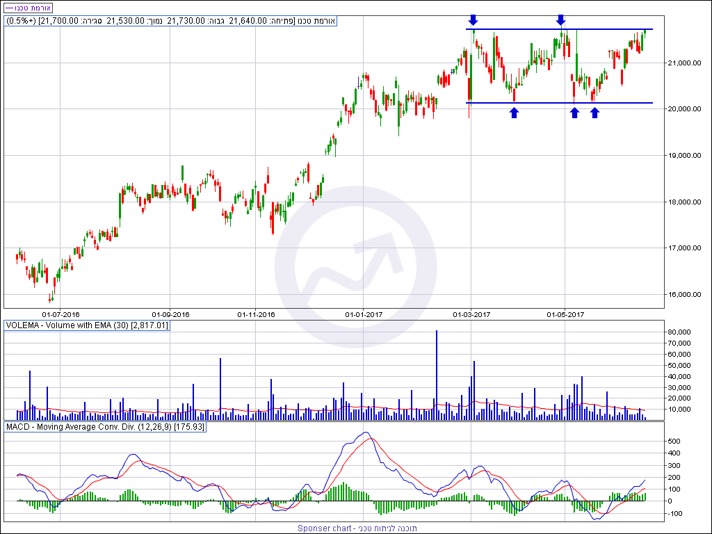 מהזווית הטכנית, המניה מדשדשת מאז חודש מרץ סביב רמות שיא. טווח הדשדוש נע בין אזור 20,100 נקודות מלמטה ואזור 21,700 נקודות מלמעלה אשר מהווה רמת שיא שנרשמה בחודש מרץ האחרון.