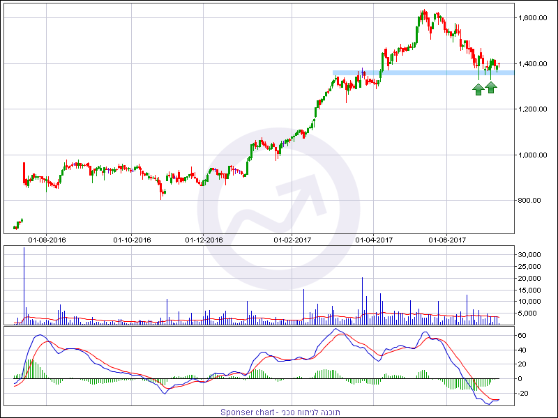 בשבועיים האחרונים המניה מתבססת מאל אזור 1,350 נקודות. אזור זה שישמש כאזור התנגדות בחודש מרץ וכעת המניה מתבססת מעל רמה זו, הפעם מלמעלה ומסמנת אותה כרמת תמיכה.