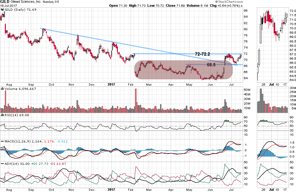חברת גיליאד (סימול- GILD) החברה עוסקת בגילוי, פיתוח ומסחור תרופות לטיפול במחלות מדבקות ומסכנות חיים. לחברה קו מוצרים תרופתיים שקיבלו אישור FDA ועוד מוצרים בשלבי פיתוח ומחקר. המוצרים המובילים של החברה כוללים את Viread, Emtriva ו- Truveda לטיפול בוירוסים מזהמים הגורמים לחסר חיסוני של הגוף. לחברה הסכמי הפצה ושיתופי פעולה אסטרטגיים עם חברות תרופות גדולות כגון בריסטול-מאיירס, סקוויב וגלאקסו סמית-קליין. מניות החברה נסחרות בבורסת הנאסד"ק ונכללת במדד נאסד"ק 100 ומדד אס&פי 500 לפי שווי שוק של 93.68 מיליארד דולר.