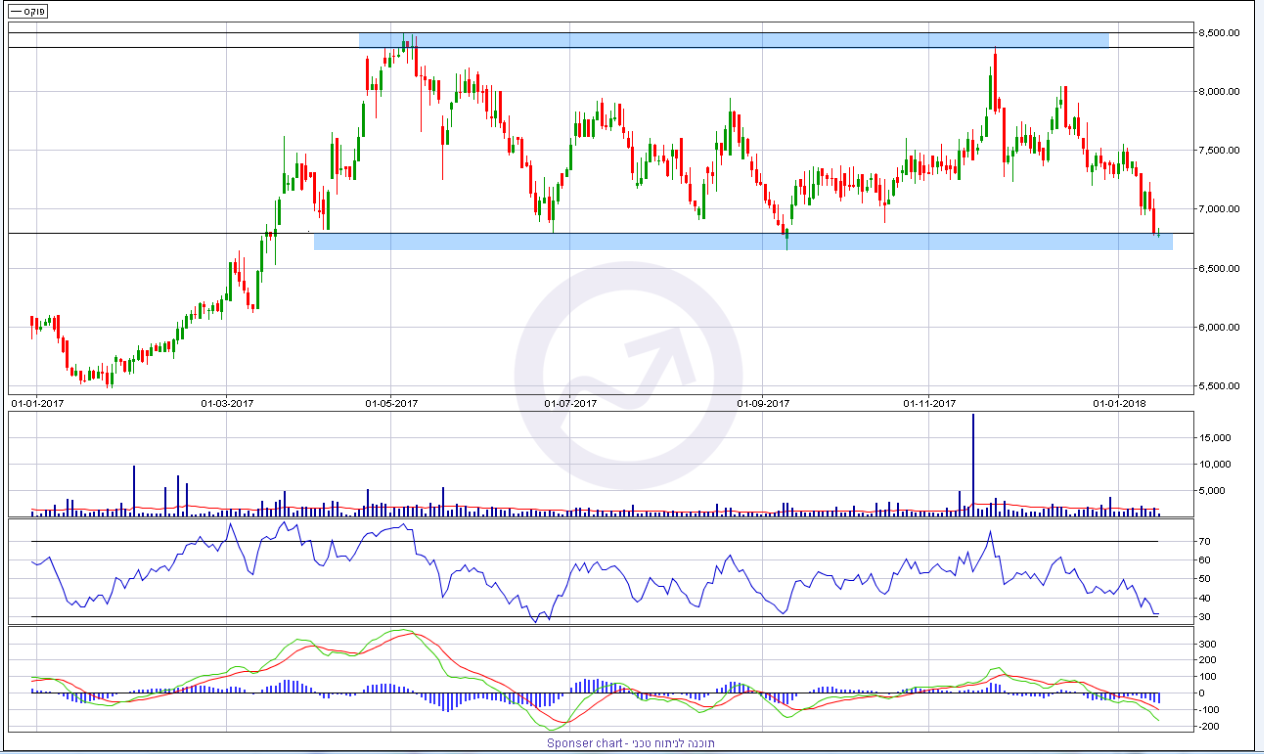 קרוב ל 10 חודשים נסחרות מניות החברה מעל אזור התמיכה החזר ברמה של 6800 נקודות ומתחת לאזור התנגדות קשה סביב 8400/500 נקודות. רמת שפל בספטמבר האחרון יצרה עוד נקודת תמיכה ברמה של 6658 נקודות כך שלמעשה קיימת רצועת תמיכה חזקה מאוד סביב רמות המחירים שצוינו לעיל